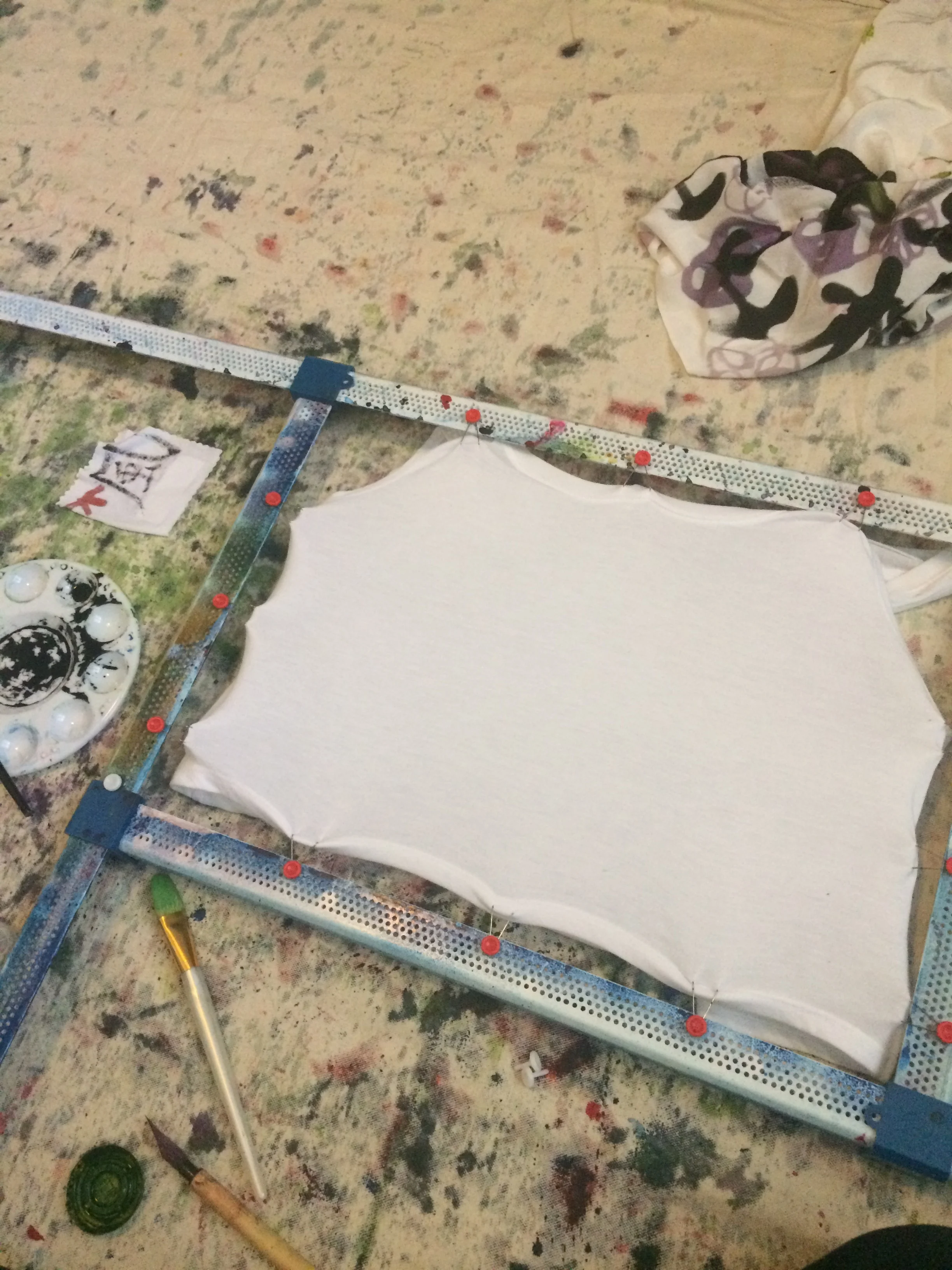 Ready-made clothing poses special challenges: how to stretch it on the frame so that you are only painting one layer, for instance. And unlike when I make clothing myself, I don't have fabric scraps to run tests on.